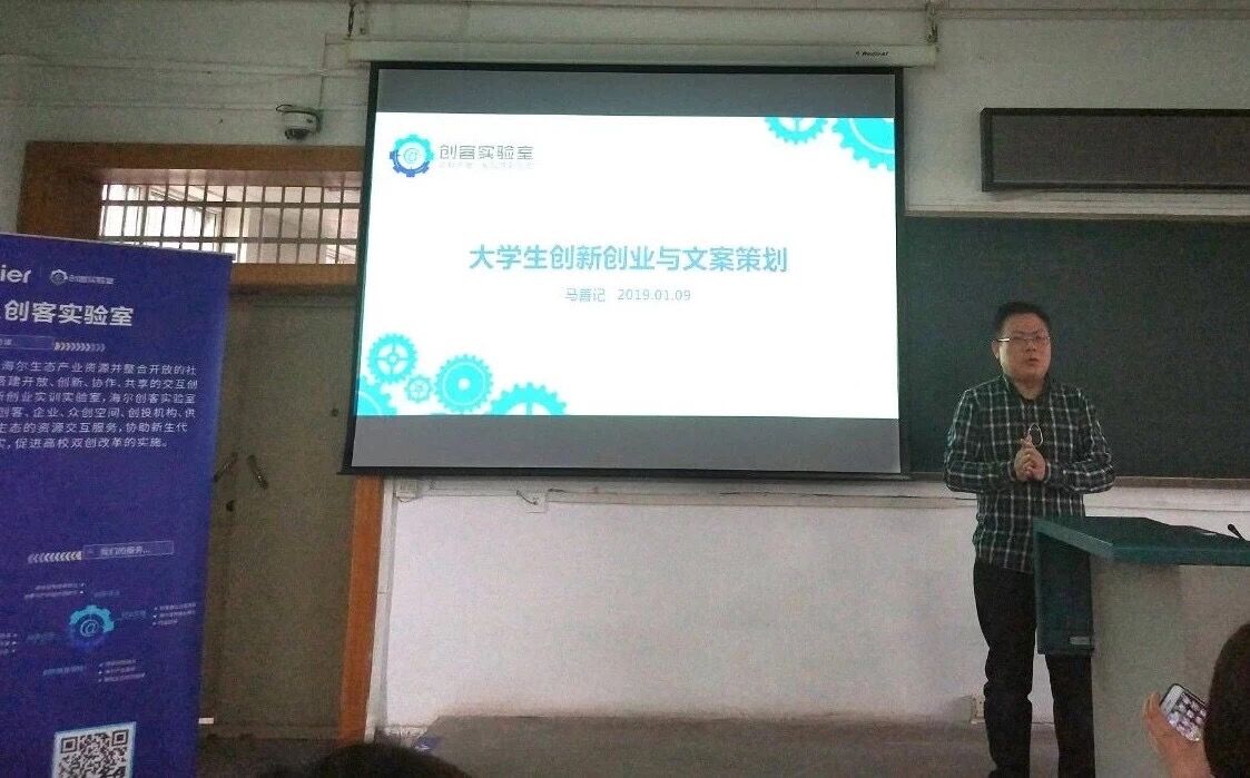 本次创客学堂邀请到武汉纺织大学客座教授、硕士生实践导师,襄阳市财政局政研室主任,《新财苑》总编辑、经济师,古隆中智库专家,知名评论人马善记老师以“大学生创业创新与文案策划”为主题带来了一场干货满满的宣讲。马善记老师为到场的大学生们提到了“大学生创新创业十三要”。“自己喜欢做的事”是马老师“十三要”的首位。“选择正确很重要,”马善记老师说,“工作后,要对自己的事业要保有激情,尤其是未来以‘创业’为目标的同学,更要紧紧把握机遇与挑战,有意识的培养出自己的人脉,学会倾听但要有主见,未来的你,要拥有自己的团队,最好懂点财务。”