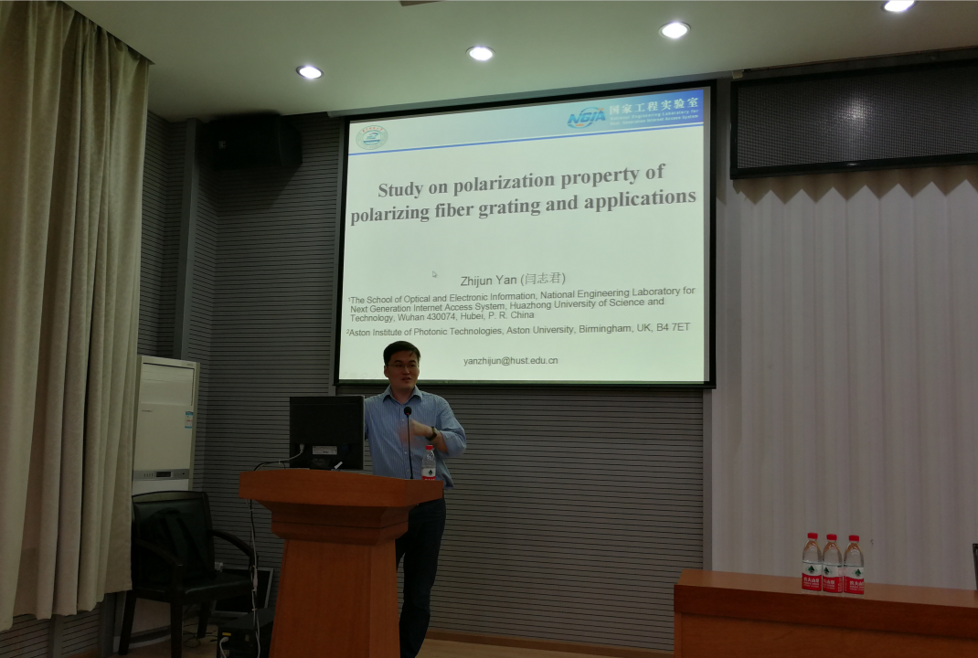 应大尺度AV天堂热国产院长丁华锋教授及科发院邀请,华中科技大学光学与电子信息学院闫志君博士于10月9号来我院作题为“倾斜光纤光栅偏振特性及其应用”学术报告。