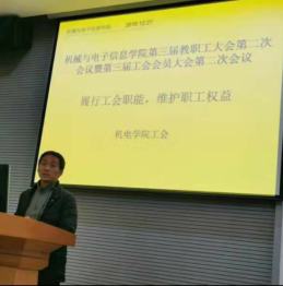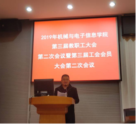 机电学院院长丁华锋同志作2019年机电学院工作报告。报告总结了机电学院一年来在党建工作、人才和师资队伍建设、科研与学科建设、人才培养、实验室建设和学生工作等方面的成效和问题,同时提出了2020年的机电学院的工作重点,并号召全院教职工共同努力,在下一年度再上新台阶。