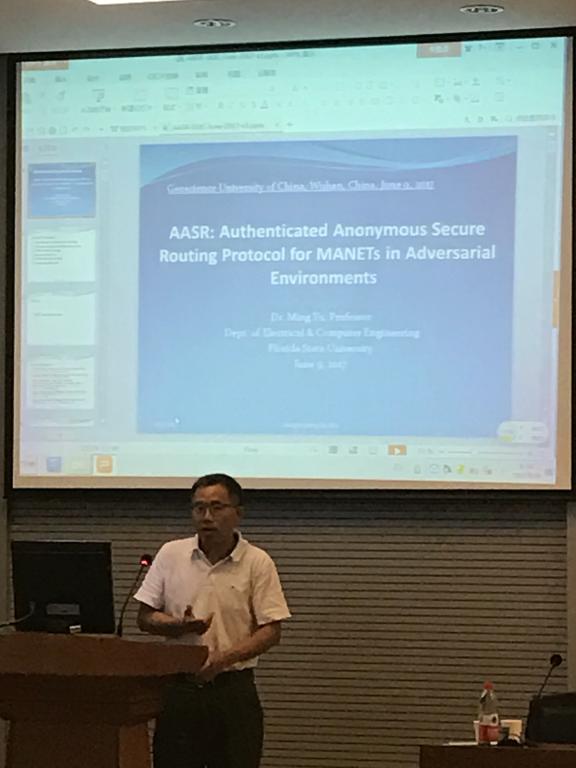 应大尺度AV天堂热国产院长丁华锋教授、科发院邀请,美国佛罗里达州立大学Ming Yu教授于6月9日来我院作题为“Authenticated Anonymous Secure Routing for MANETs in Adversarial Environment”的学术报告。
