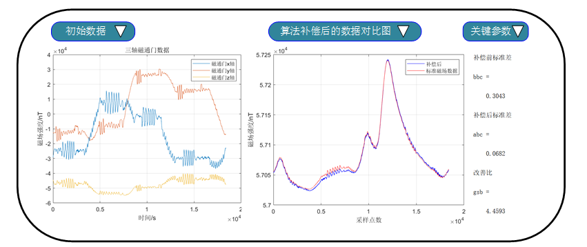 题目要求使用Matlab设计飞机航磁补偿软件,通过理解飞机磁干扰场产生的原因,建立飞机磁干扰场的模型,目标软件能够正确显示总磁场、三轴磁通门的数据,通过公式计算补偿前后的标准差、改善率、FOM值等并显示到软件上。