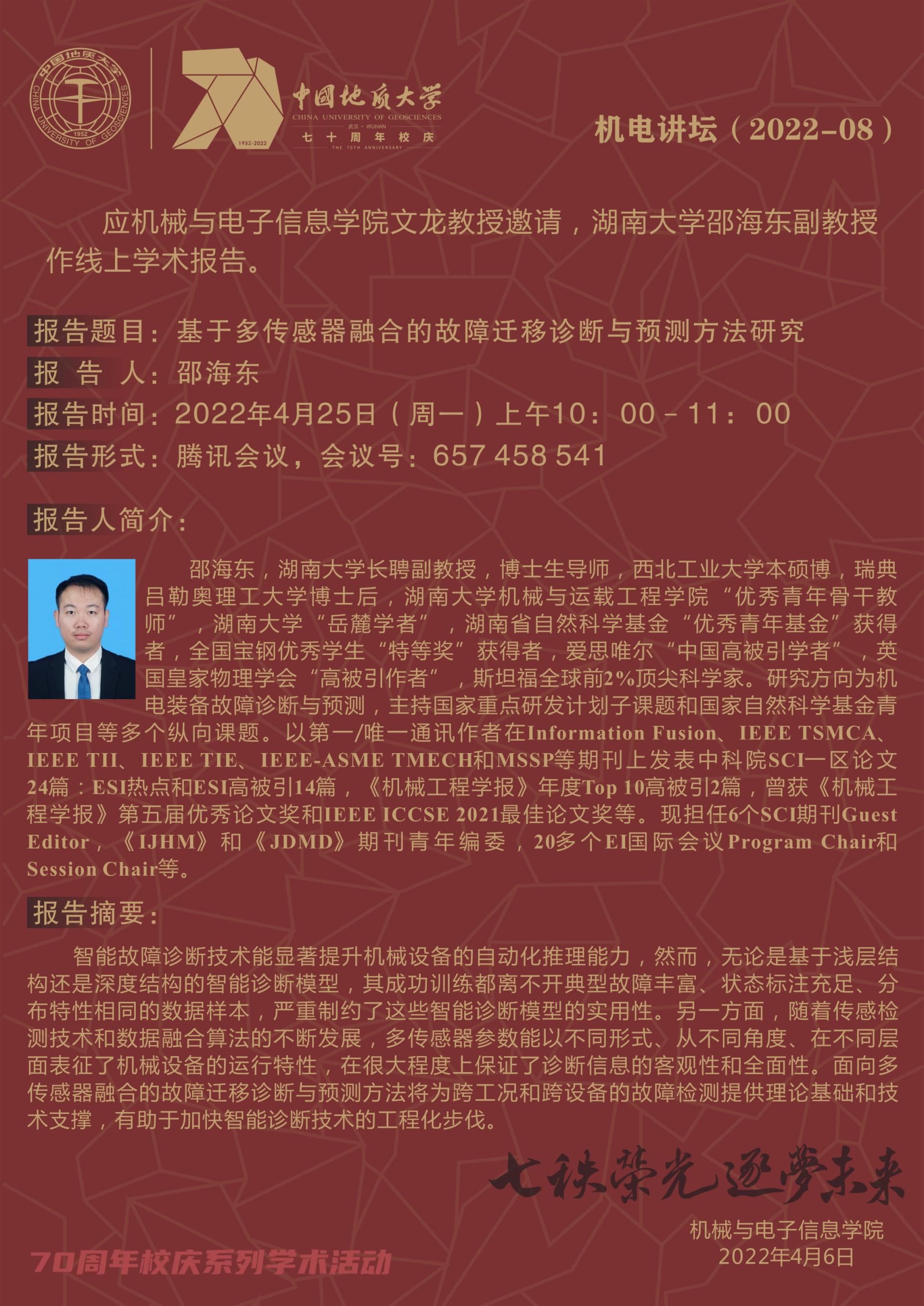 机电讲坛(2022-08):湖南大学邵海东副教授学术报告