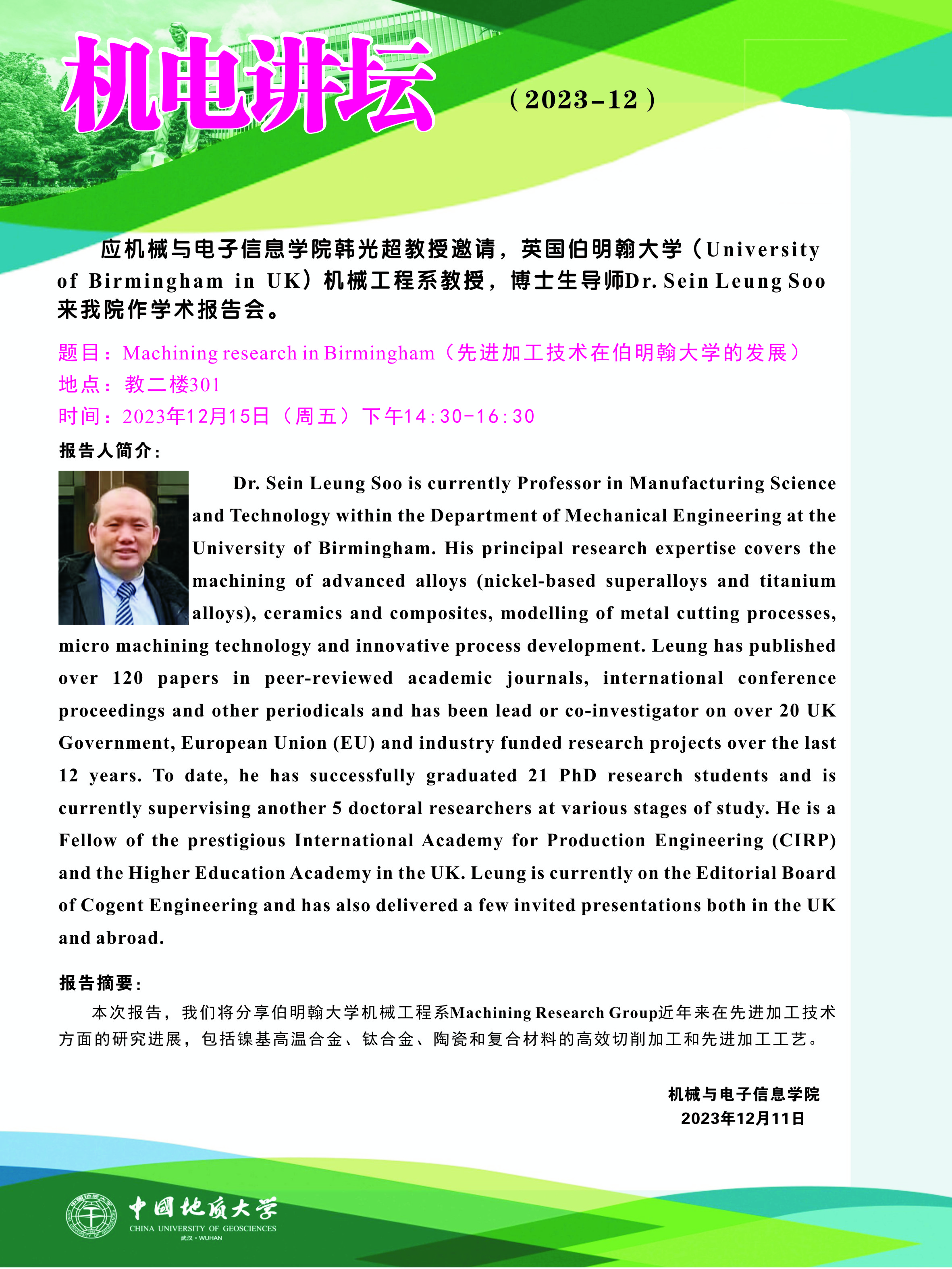 【12月15日】机电讲坛(2023-12):英国伯明翰大学Dr. Sein Leung Soo来我院作学术报告会