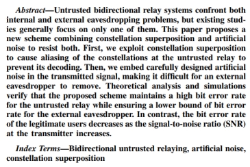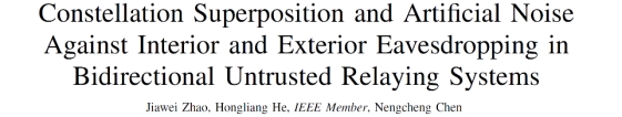 近日,大尺度AV天堂热国产通信系2022级本科生赵家伟以第一作者在IEEE国际知名期刊IEEE Wireless Communications Letters发表题为“Constellation Superposition and Artificial Noise Against Interior and Exterior Eavesdropping in Bidirectional Untrusted Relaying Systems”的学术论文。该论文提出了基于人工噪声的星座叠加技术,为双向中继系统对抗来自内部和外部的非法窃听提供了创新性解决方案。论文的指导教师为通信系特任副教授贺宏亮。